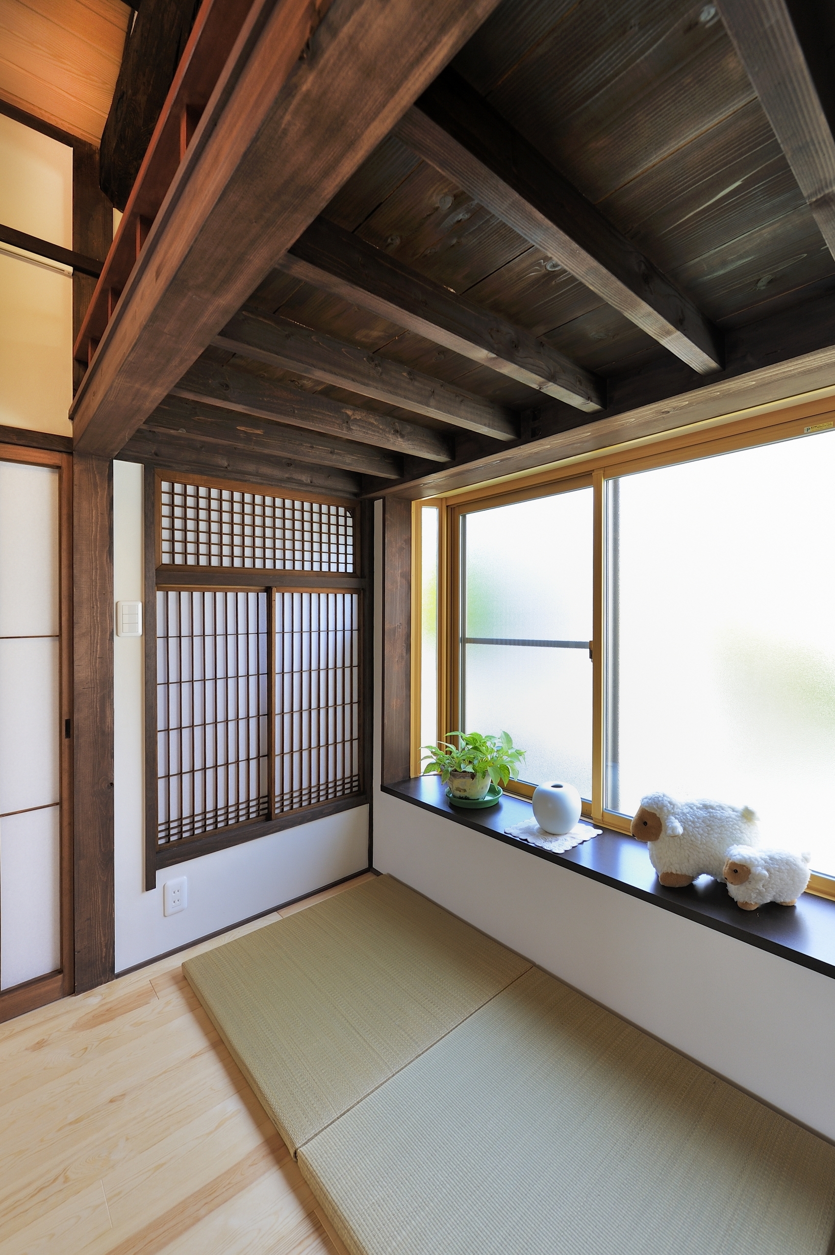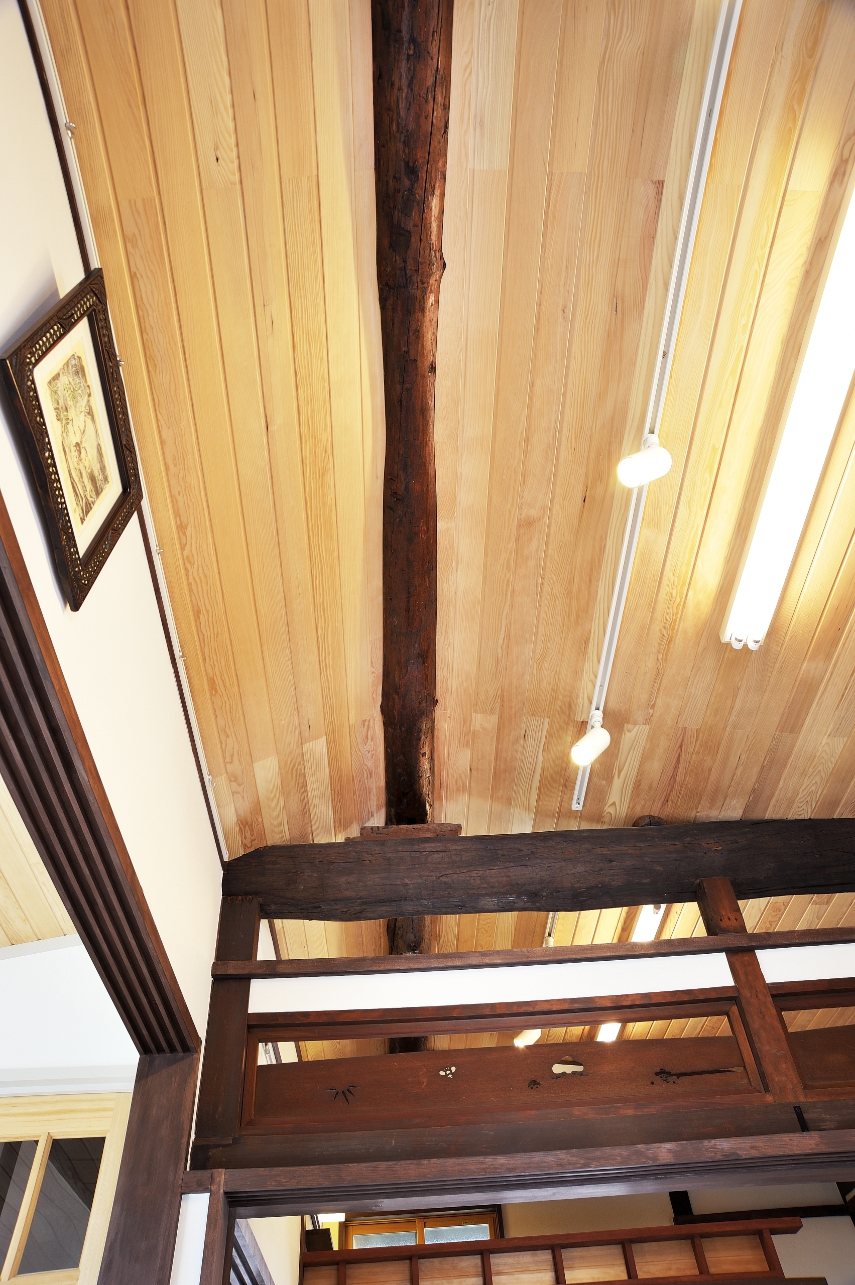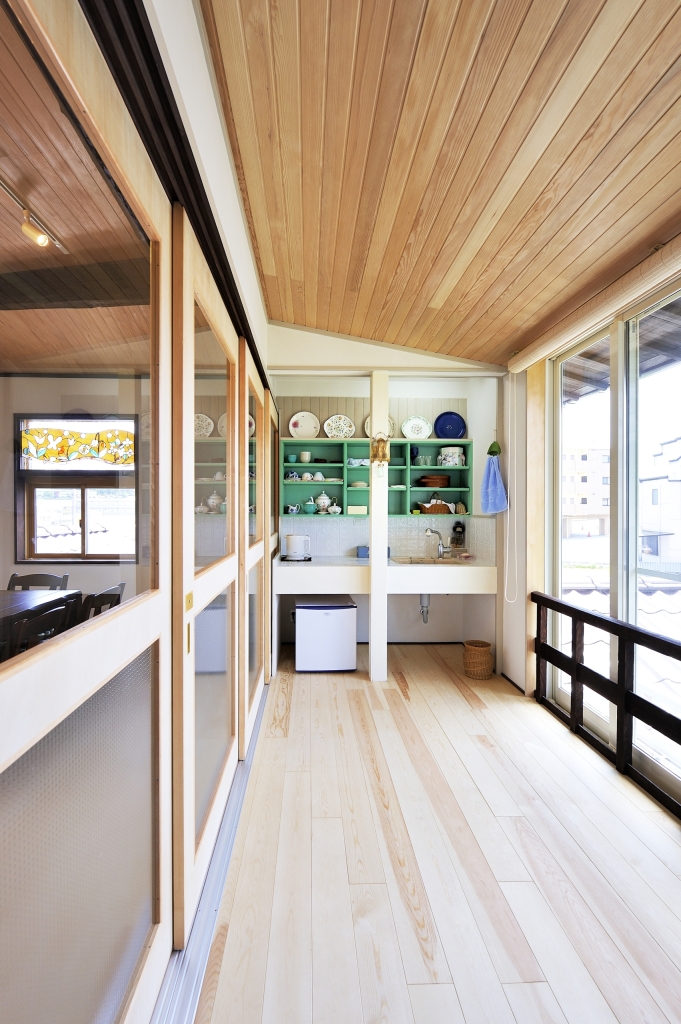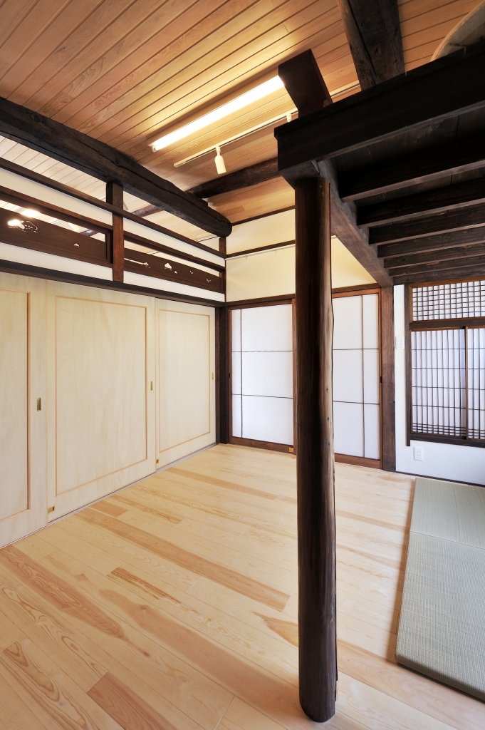3つの部屋は和洋の度合いが違う3つのお部屋になりました。新旧の旧は、天井の梁、廊下すみにあった細かい目の障子、床柱、かわいい彫りの欄間、廊下の手すりで、それぞれが空間を締めるように新しい意匠に交じり合っています・・・多くの人が混じり合い響きあう空間にふさわしく。
